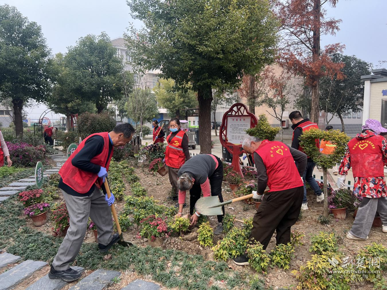 社區(qū)志愿服務(wù)隊(duì)與下沉黨員一起培育菊花。通訊員供圖