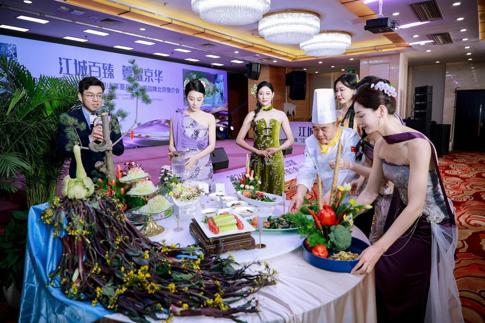 活動現(xiàn)場,《千年一“薹”,京誠所愛》情景劇生動詮釋洪山菜薹的傳承與創(chuàng)新,產(chǎn)品走秀與藝術(shù)插花表演凸顯其美學價值,楚菜名廚現(xiàn)場演繹“一薹多吃”宴席,展現(xiàn)菜薹融入京鄂風味的烹飪創(chuàng)意。京城網(wǎng)紅大廚隋坡登臺品鑒,為洪山菜薹實力“打call”。現(xiàn)場同步設(shè)置國風市集,展出鮮薹、鎖鮮產(chǎn)品及禮盒,供嘉賓品鑒體驗。