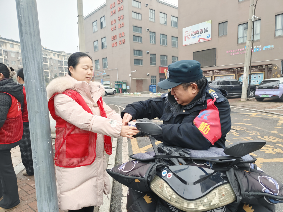 小軍山社區(qū)第一時(shí)間將熱粥送到了戶(hù)外工作者手中。通訊員供圖