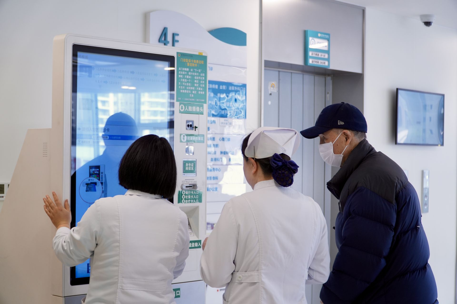 進(jìn)入門(mén)診大廳,導(dǎo)診臺(tái)、自助掛號(hào)機(jī)分布在顯眼位置。記者注意到,多名醫(yī)護(hù)人員和志愿者在大廳內(nèi)來(lái)回巡查,看到行動(dòng)不便的老人,便主動(dòng)上前詢問(wèn),幫忙完成掛號(hào)等流程,就診秩序平穩(wěn)有序。