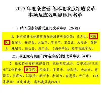 近日,湖北省優(yōu)化營(yíng)商環(huán)境領(lǐng)導(dǎo)小組對(duì)2025年度全省優(yōu)化營(yíng)商環(huán)境重點(diǎn)領(lǐng)域改革事項(xiàng)及成效明顯地區(qū)進(jìn)行通報(bào)表?yè)P(yáng)。其中,黃陂政務(wù)服務(wù)領(lǐng)域兩項(xiàng)創(chuàng)新改革納入國(guó)家部委試點(diǎn),獲國(guó)家有關(guān)部門(mén)肯定,彰顯區(qū)域改革擔(dān)當(dāng)與服務(wù)實(shí)力。