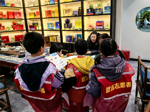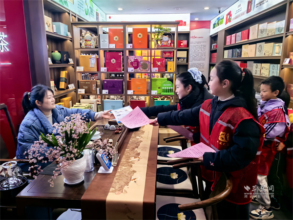 來自樓宇托管班的十余名小學(xué)生,在志愿者引導(dǎo)下化身“小小安全宣傳員”。他們身著“紅背心”,手持禁鞭宣傳折頁和倡議書,分組走進陸羽茶都商鋪和人群聚集點,向商戶、顧客及過往市民講解煙花爆竹禁燃禁放的相關(guān)規(guī)定、潛在危害及環(huán)保意義,并分發(fā)倡議資料。