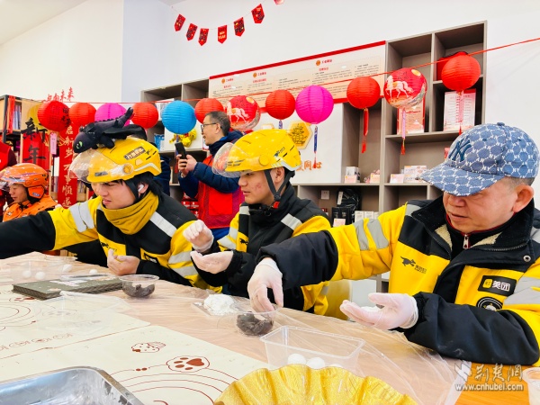 活動(dòng)現(xiàn)場(chǎng),手工DIY區(qū)準(zhǔn)備了糯米粉、黑芝麻餡、豆沙餡等原材料,黃鶴樓消防站的消防員與外賣騎手、快遞員們圍坐在一起,揉面、包餡、搓圓,體驗(yàn)親手制作湯圓的樂(lè)趣。