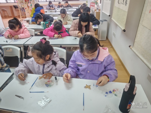 非遺胸針DIY環(huán)節(jié),“閱讀媽媽”一對(duì)一指導(dǎo)大家如何將黃鶴樓元素、荊楚紋樣融入指尖創(chuàng)作。一枚枚精美的胸針逐漸成型,文化記憶也被定格于方寸之間。當(dāng)孩子們將親手制作的胸針佩戴于胸前時(shí),臉上洋溢著滿(mǎn)滿(mǎn)的成就感與自豪感。