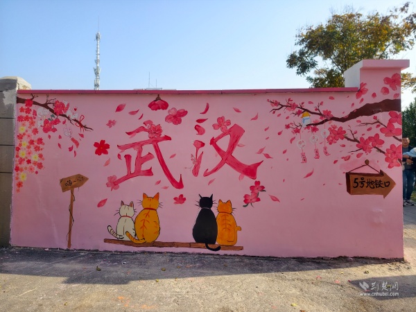 走出彭劉楊路地鐵B2口,來到社區(qū)八卦井旁,一面粉墻惹人注目,櫻花飛揚、四只貓咪相依蹲坐。在社區(qū)攜手武漢學院藝術(shù)與傳媒學院青年志愿者開展的“墻上生花,美在西廠”主題活動中,10余名青年志愿者用畫筆和創(chuàng)意,打造出這面繪有櫻花和貓咪的“武漢”主題墻。