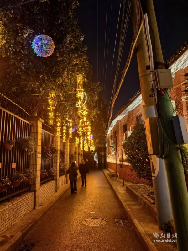 這個由社區(qū)與共建單位湖北省農(nóng)業(yè)事業(yè)發(fā)展中心共同策劃改造的“詩詞長廊”,創(chuàng)新融合了詩詞文化與光影藝術(shù)。夜幕降臨,一盞盞詩詞燈帶悄然亮起。柔和光暈下,“晴川歷歷漢陽樹,芳草萋萋鸚鵡洲”的古韻與墻上“蒜鳥”“七飯”等俏皮的武漢方言點綴其間,歷史與當下在光影交錯間完成了隔空對話。